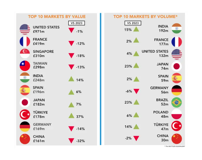Distile içkilerde en önemli büyümeyi viskide gözlemliyoruz. 2013’ten bu yana inanılmaz bir hızla büyüme gösteren viski endüstrisi 2024 yılında rakının sadece 5 milyon altında 34.7 milyon litre olarak karşımıza çıkıyor ve bu tam %21 lik bir büyümeye karşılık geliyor. 2014 yılında 6 milyon litreyken 10 sene içinde tam 6 kat artıp bu düzeylere ulaşması çok heyecan verici. Türkiye viski pazarının çok büyük bir kesimi İskoç viskileri olduğu için bu büyüme global dataları da etkilemeye başladı ve Türkiye tarihinde ilk kez hem değerde hem litrede dünyanın en büyük 10 viski pazarı arasına girmeyi başardı (SWA’in 2024 verilerini aşağıda görebilirsiniz)