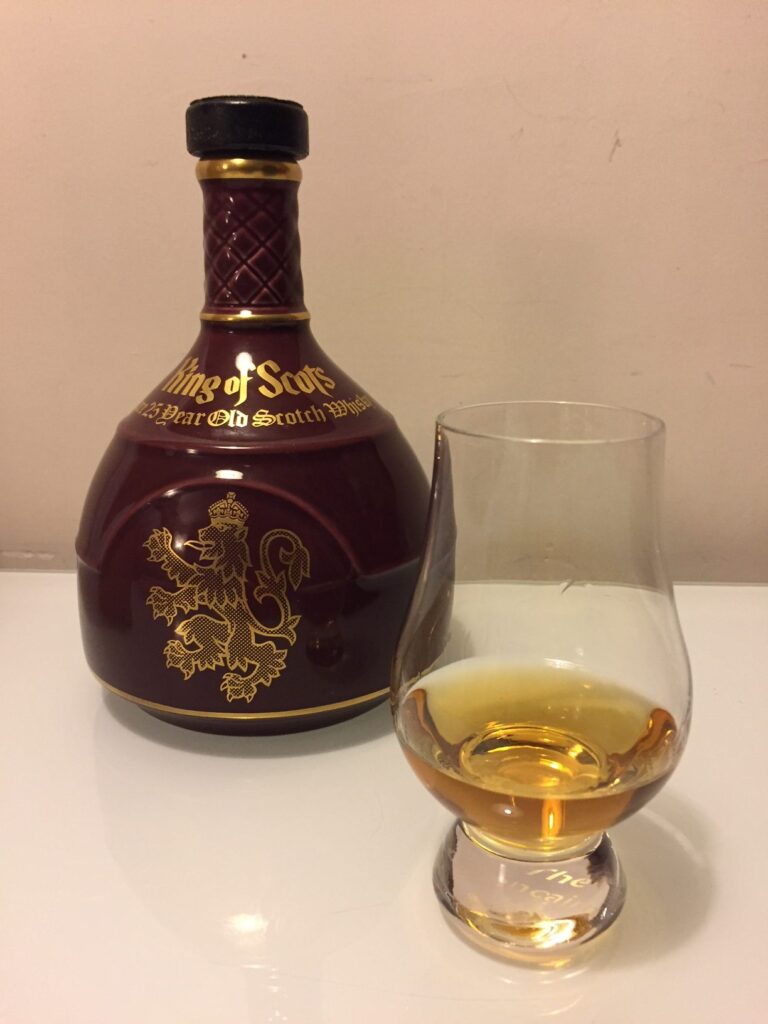 Geceye bağımsız şişeleyici Douglas Laing’in %43 alkol oranıyla şişelediği eski özel sürümlerden biri olan King of Scotland 25 ile başladık. Şık seramik şişesinden kadehlerimize dökülen bu özel viskiyle ilgili tadım notlarım: