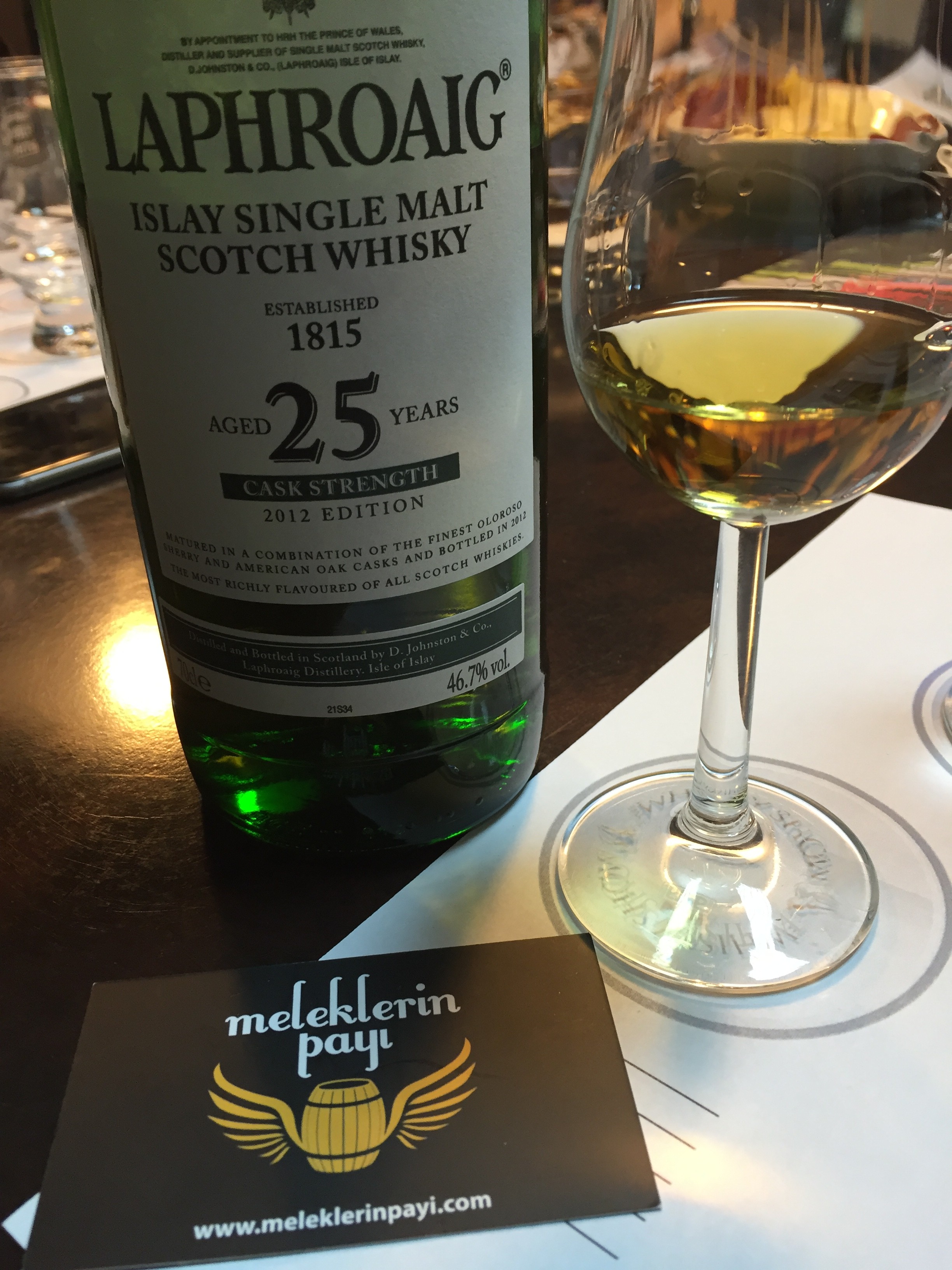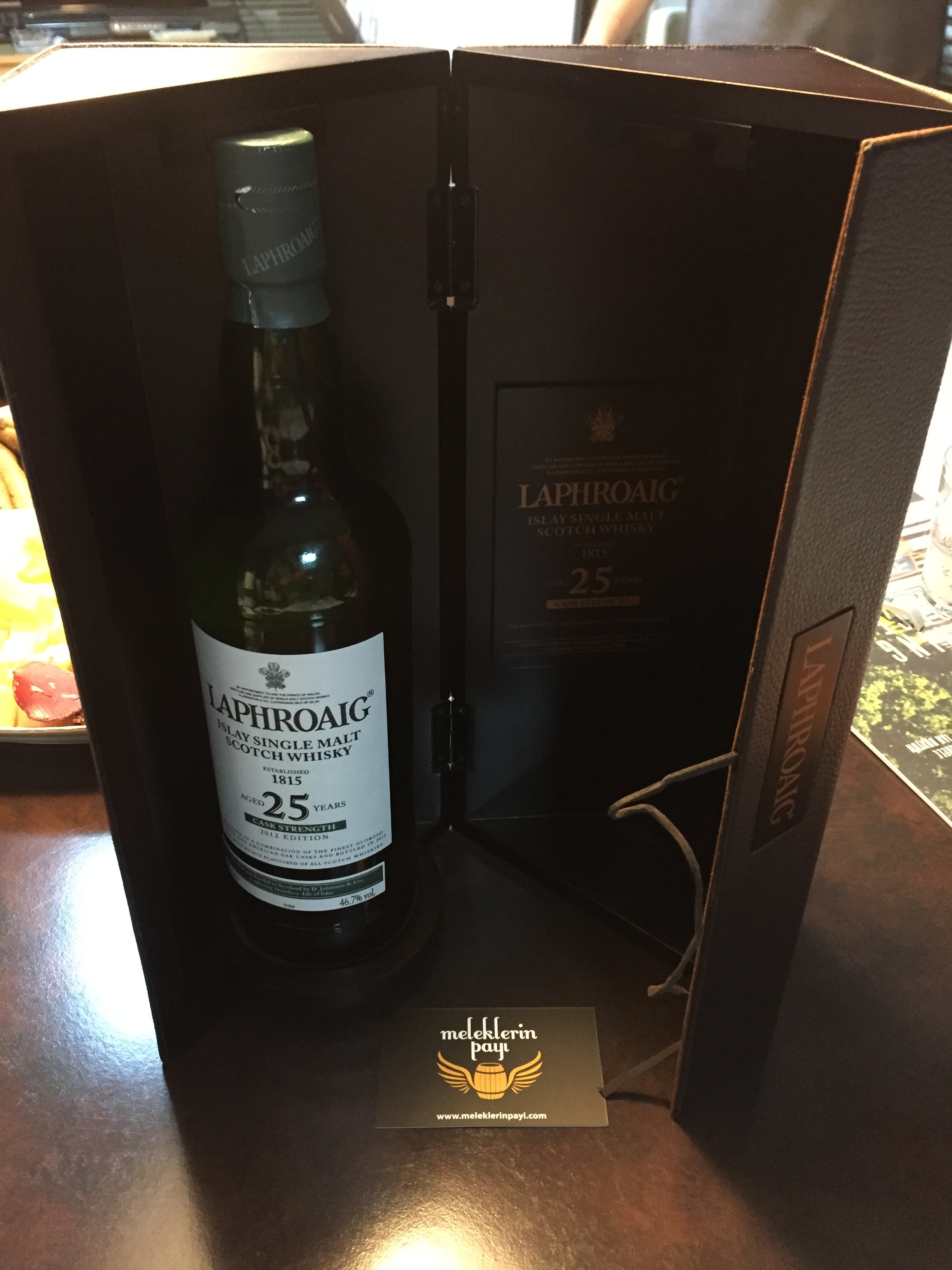 Elimizdeki şişe 2012 dolum %46.7 alkol oranıyla şişelenmiş bir Laphroaig 25‘ti. Geçen sene Whisky Show 2014’te 2011 ve 2014 dolum 25 leri tattığım ve 2011 ekspresyonuyla biraz hayal kırıklığına uğradığım için bu tadımı iple çekiyordum. 3 şişenin notlarını biraraya getirerek ayrı bir yazı kaleme almak da yazı planlarım arasında.