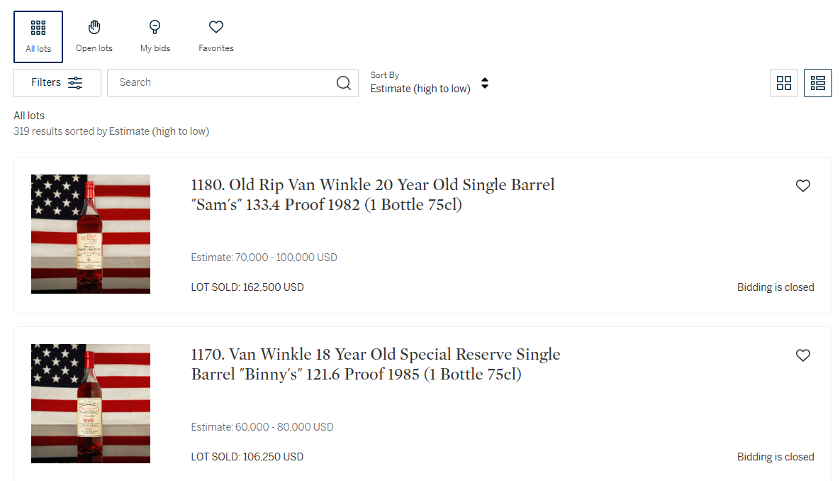 24 Ocak 2026’da Sotheby’s tarafından gerçekleştirilen The Great American Whiskey Collection müzayedesinde 162.500 USD’a alıcı bulan Old Van Winkle 20 Year Old en pahalı Amerikan viskisi rekorunu kırdı. Müzayedede 319 lot halinde satışa çıkan şişelerden toplam 2.504.892 USD elde edildi.