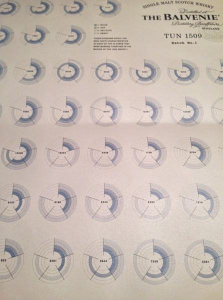 The Balvenie bu deneyde daha da ileri gidiyor ve 42 fıçının her birinin tadım notlarını tek bir şemada toplayarak viskiseverlerle paylaşıyor. Resimde her fıçının farklı karakteristikleri olduğunu görebilirsiniz.