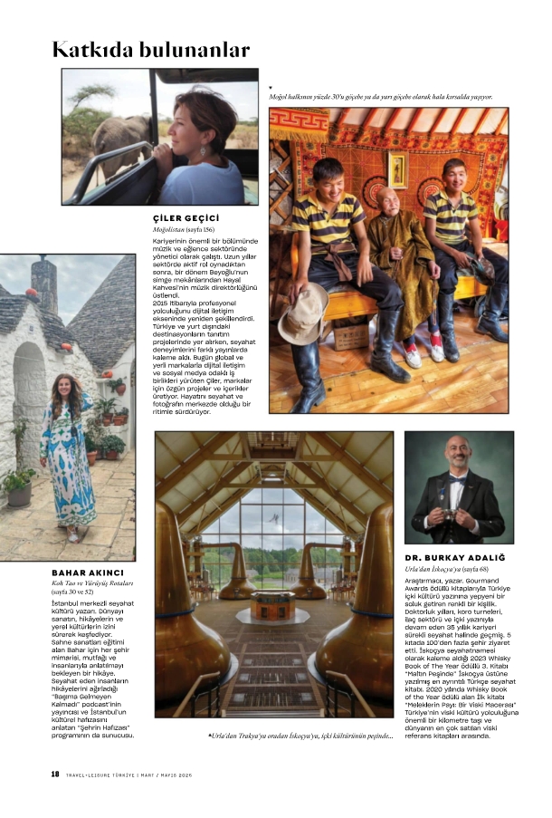 Keşifler bölümünde dünyanın farklı köşelerine uzanan rotalar var. Bahar Akıncı Tayland’daki Koh Tao’yu ve Türkiye’den az bilinen yürüyüş rotalarını ele alıyor. Özlem Avcıoğlu dünyada yeni açılan otel ve resortları incelerken aynı yazıda New York’un güncel ritmine de bakıyor. Aynur Erdem ise Güney Afrika’daki yavaş şehir Sedgefield’i mercek altına alıyor. Deneyim bölümünde yolculukların ritmi biraz daha yavaşlıyor. Özlem Avcıoğlu İngiltere’nin pastoral Cotswolds bölgesini yazarken, Levent Gürçay memleketi Ayvalık’a kişisel bir bakış sunuyor. Burkay Adalığ Urla şarap yolundan başlayıp İskoçya’ya uzanan bir içki rotası çıkarıyor. Sinan Sökmen Tazmanya’yı ele alırken, Ceren Arseven Alaçatı, Mardin, Adana ve Urla’daki festivallerle Türkiye’nin farklı şehirlerinin enerjisini bir araya getiriyor. Hatay ise Jale Balcı ve Banu Yentür’ün yazılarıyla içeriden bir bakışla yeniden keşfediliyor.