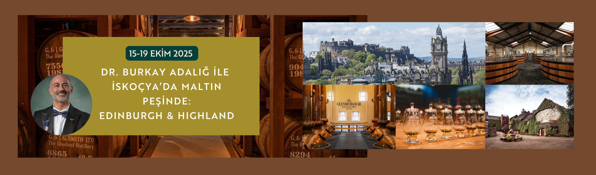 15-19 Ekim 2025 tarihlerinde Dr. Burkay Adalığ eşliğinde gerçekleştireceğimiz İskoçya’da Maltın Peşinde: Edinburgh & Highland turumuza davetlisiniz! Türkiye’de viski kültürünün gelişmesine önemli katkılarda bulunan ve İskoçya viski sektörüne yaptığı üstün hizmetlerle “Keepers of the Quaich” nişanını almış olan Dr. Burkay Adalığ, tur boyunca İskoçya’nın ev sahipliği yaptığı damıtımevlerinde gezintiye çıkmamıza ve özel tadımlar yapmamıza eşlik edecek. Ayrıca, çok satan kitabı “Maltın Peşinde”de anlattığı İskoçya ve viski kültürü hakkında keyifli sohbetler gerçekleştirerek unutulmaz anılar biriktirmemizi sağlayacak. Turumuz sırasında Glenmorangie, Clynelish, Blair Athol, Tomatin gibi dünya çapında tanınan damıtımevlerini ziyaret edeceğiz. Johnnie Walker Princess Street ziyaretimiz ile tadımlara ek olarak harika bir maceraya çıkacağımız bu sıra dışı tur ile üretim sürecini adım adım takip edeceğiz. Dr. Burkay Adalığ’ın bilgi dolu danışmanlığı sayesinde İskoçya’nın viski özelinde kültürel ve tarihi zenginliklerini keşfedeceğiniz beş duyunuza hitap eden harika bir Edinburgh & Highland turu deneyimi sizleri bekliyor.