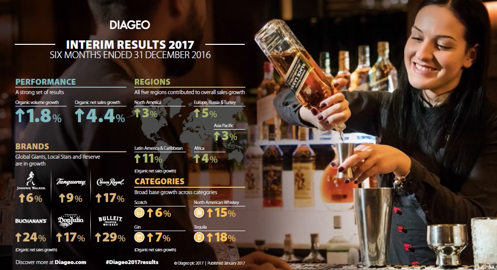 Diageo geçtiğimiz günlerde açıkladığı ara dönem raporuyla Scotch kategorisinde (Johnnie Walker ve single maltlar) %6 ve American kategorisinde (Bulleit Bourbon) %15 lik büyüme yakaladığını açıklamıştı.