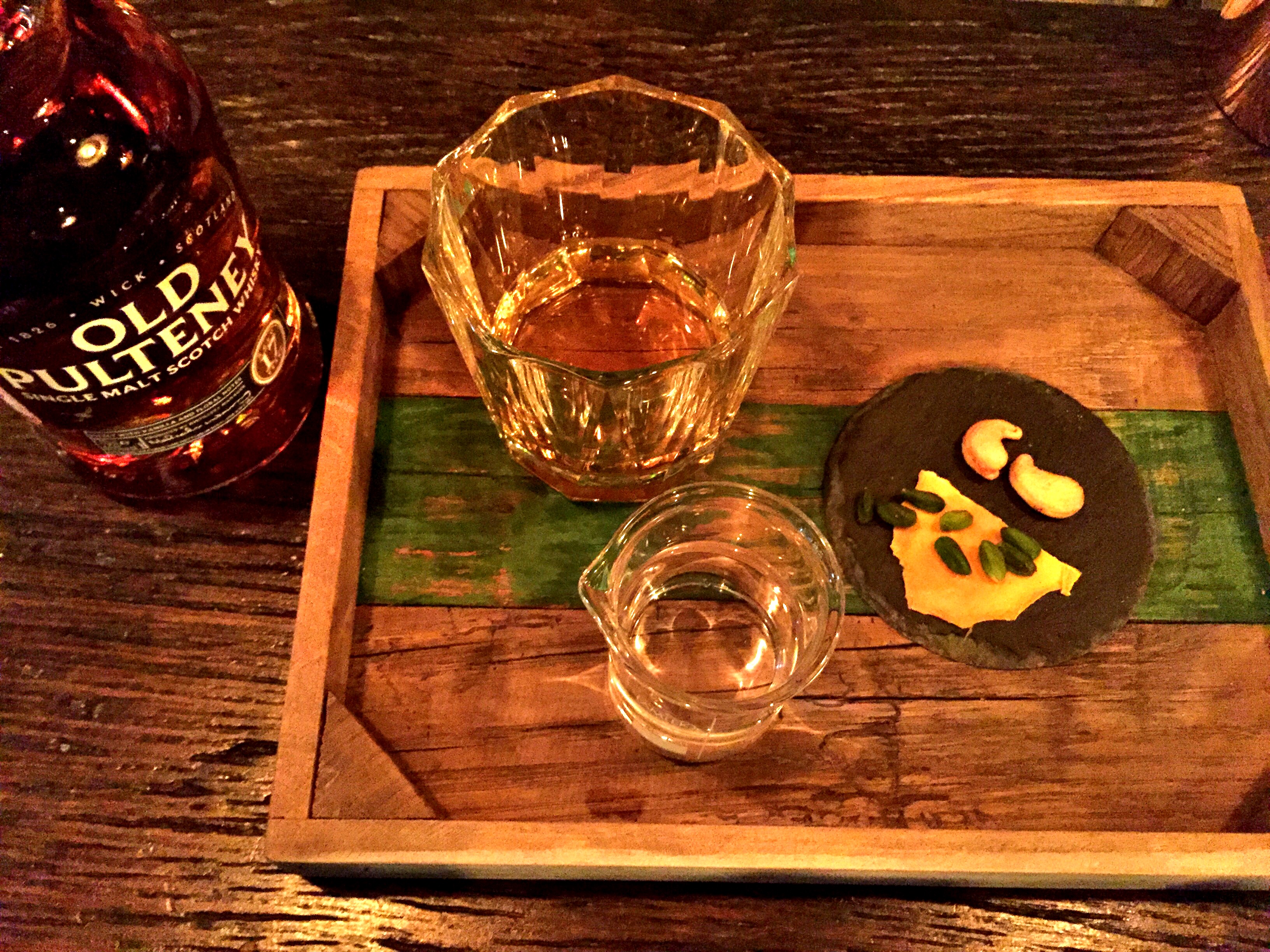 House of Hops & Barley şef Ömer Bozyap’ın özenli çalışmasıyla önemli bir farka daha imza atmış. Her markaya/bölgeye uygun eşlikçilerin barda bir büfe şeklinde barmenin elinin altında olması ve her servisle birlikte şık bir taş tabakta eşlikçilerin sunulması viskiden aldığımız tadı artırıyor. Benim mekandaki ilk tercihim Türkiye’ye çok kısa zaman önce giriş yapan Old Pulteney 17 oldu. İskoçya’nın en kuzeyindeki damıtımevi olan Pulteney damıtımevinden çıkan Old Pulteney’in yanında sunulan kaju ve antep fıstıkları viskinin kremamsı ve meyve salatasını andıran zengin karakteriyle çok uyumluydu. Speyside Flight’ının yanında servis edilen pestil, çikolata, badem ve kurutulmuş çilek kombinlerinin de Speyside karakterine çok yakışan eşlikçiler olduğunu düşünüyorum. Speyside flight’ı için Cardhu 12, Glen Elgin 12, Singleton 12, Aberlour 12 ve Balvenie Doublewood 12 seçilmiş; adeta bir “viskiye başlangıç seti”